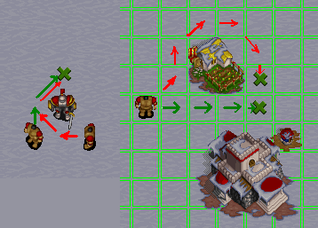 Когда-то, я выяснял про эти особенности "траектории движения", но всё забылось :( ковыряться лень. Попробую общее набросать. В двух словах: из-за быстрого алгоритма поиска пути, страдает качество: По умолчанию, рисуется этакая "пиксельная" корявая линия. и при натыкании на препятствие всегда идёт обход с левой стороны, после этого иногда включается поиск альтернативного обхода, а иногда - нет. При большом препятствии и больших расстояниях - всё "почти хорошо": "анализатор" чаще включается, чем простаивает. А при среднем или малом препятствии и малых расстояниях от него и до него - всё плохо: Сложно сказать, с какого именно порога расстояний это происходит, но уж точно это относится к при беготне по чужой базе) - препятствие в 99% случаев будет обходиться с левой стороны. Видимо, подход при создании был примерно такой: "маршрут уже сосчитан - он относительно короткий - так сойдёт" :) Что иногда, мягко говоря, не оптимально. Плюс, считается то это всё в движении, ведь огры не будут стоять и ждать, пока всю их базу взорвут, поэтому и их перемещения могут поменять маршрут - переставишь такую живую "затычку" -> маршрут сменился -> уже обход по-другому.